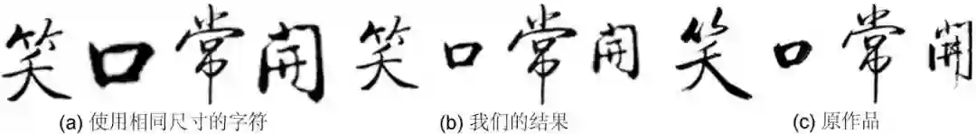不同于绘画作品绘制顺序变化多样,书法作品的写作顺序往往是约定俗成的。现有方法通过大量人力物力进行字体库设计,且现有的字库多采用统一的字号,但实际上书法家在书写时字体大小变化多样。即便处于同一副作品中,不同位置的同一个字符大小也不尽相同。