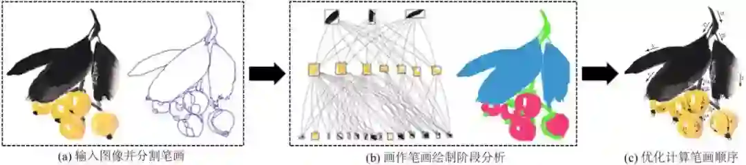 具体而言,将一张静态的写意作品的扫描件(或照片)输入,然后提取画作中的笔画,对笔画进行合理分析建模,由笔画间相互关系推断绘制过程,并设计渲染方法进行动态重构展示。