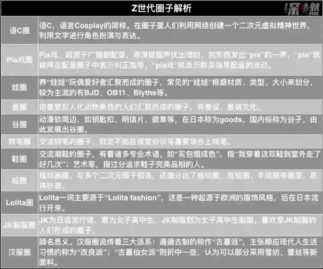 比如将社交网络上的虚拟游戏模式发挥到极致,诞生出语C圈、Pia戏圈;对生活兴趣爱好投入到极致,出现了鞋圈、笔圈、绘圈、滑板圈等各色圈层;当然,前卫新潮的小众文化他们也不会落下,娃圈、谷圈、兽圈也都活跃着他们的身影。