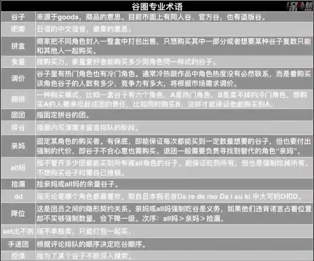 与JK制服圈、Lolita圈、汉服圈相似,谷圈也有专业的圈内术语和规则,诞生出诸如拼盒、收肾、吃谷、排谷、食量、扫街等行话。