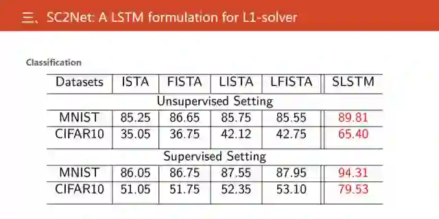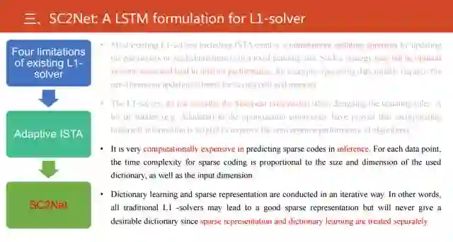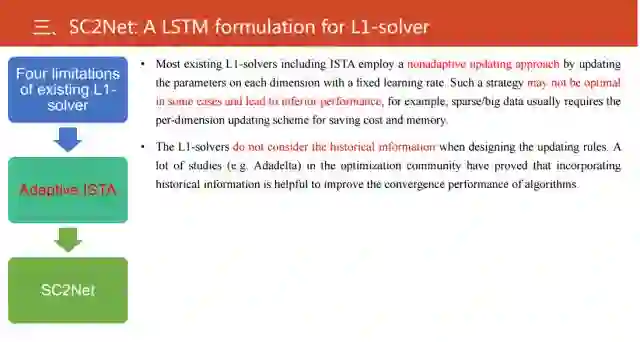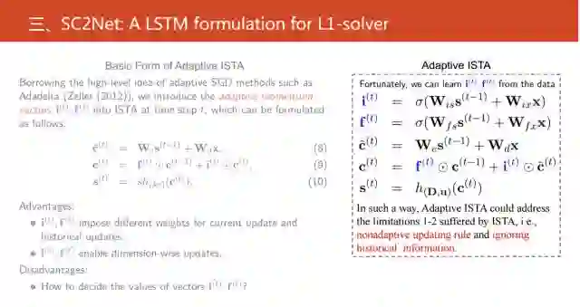 左边是ISTA的关键的优化步骤,基于此,我们引进了动量向量(i(t),f(t))。这就是标准的受益于现代的优化的一些相关的方法,通过引入这两个量,从而解决非自适应更新问题和没有考虑历史信息的不足。更进一步来看,这里存在一个问题,i(t),f(t)如果是两个向量的话,只能确定它的值。使用传统的机器学习方法进行训练,我们人为指定它的值。在研究中,发现可以把这两个向量当成两个变量从数据中学习,就产生了我们提出的自适应ISTA。