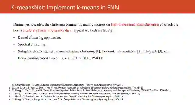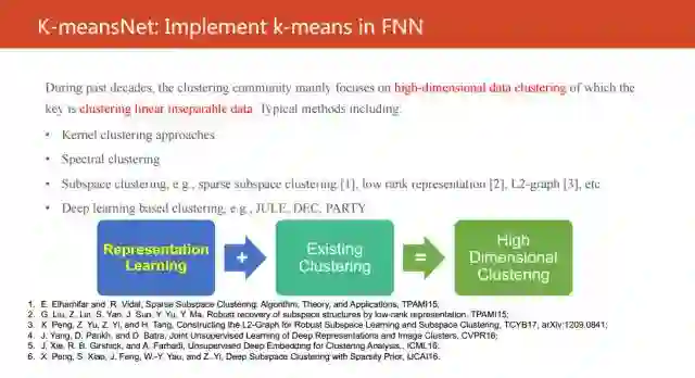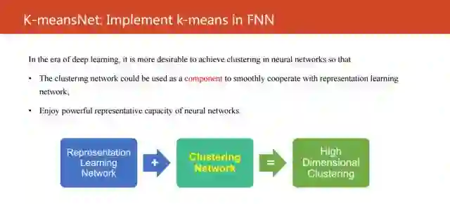 因此,我们就认为如果表示学习能够用深度神经网络来解决,我们是不是要考虑更多的研究能够实现聚类的神经网络。但是让我们惊讶的是,目前非常少的工作研究能以一个神经网络来实现聚类的,寥寥可数,比较知名一点的比如说自组织映射。