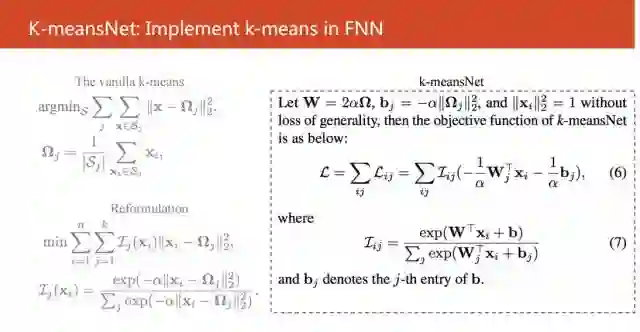 如果大家只看左边的神经网络,大家可能会觉得非常不稀奇,好像就是一个很简单的Sigmoid函数,再加上一个隐含层的神经网络。但是如果结合右边的公式来看,就会发现,这么简单的神经网络是等价于K-means的。