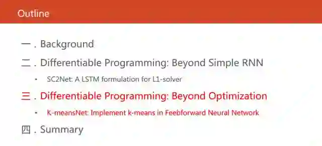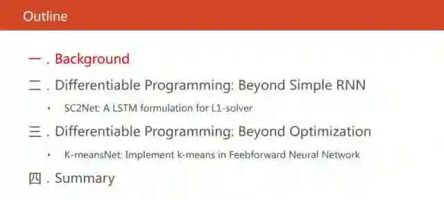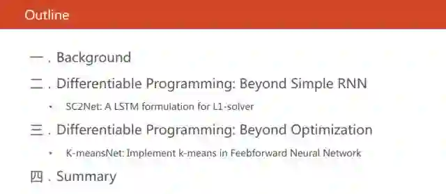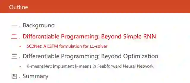 第二部分,介绍我们的第一个工作。现在大多可微编程是把优化过程展开,转换成回复式神经网络。而我们这项工作也是把优化过程展开,发现能够得到新的长短期记忆,再从可微编程角度,找到与长短期记忆网络的连接。