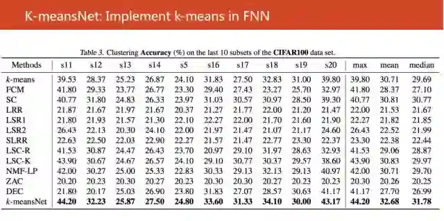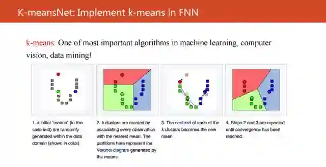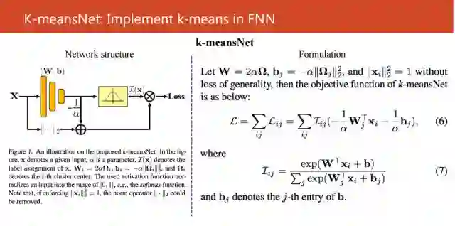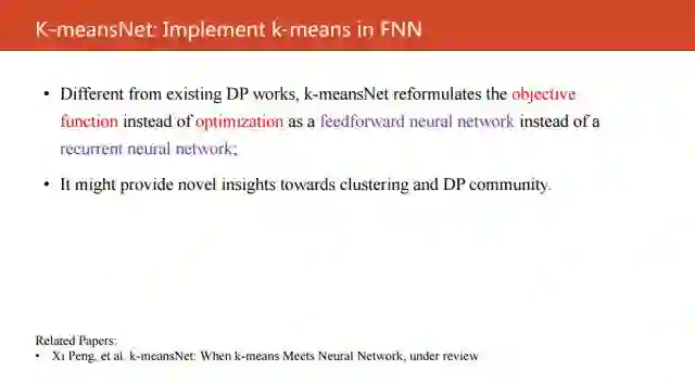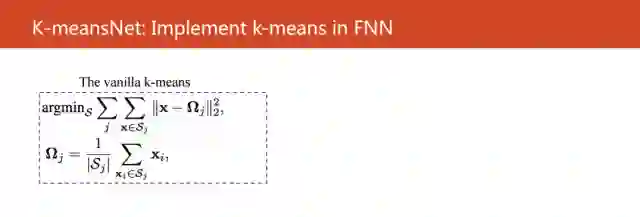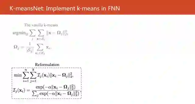 第二个工作较之前更进一步,是在聚类这个背景下来扩展,把k-means这个聚类算法转化成为一个前向式记忆网络。不同于现有的可微编程的方法,它是从优化的角度出发,我们直接把k-means聚类算法的目标函数直接进行变形,然后建立对应的神经网络模型。