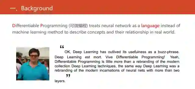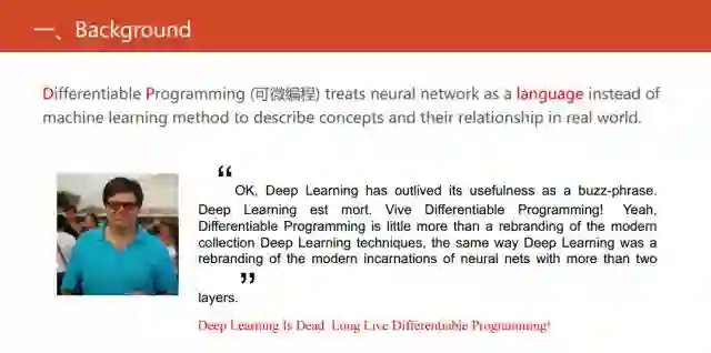 LeCun曾在facebook的文章里说:”Deep Learning Is Dead. Long Live Differentiable Programming!” (深度学习已死,可微编程永生)。