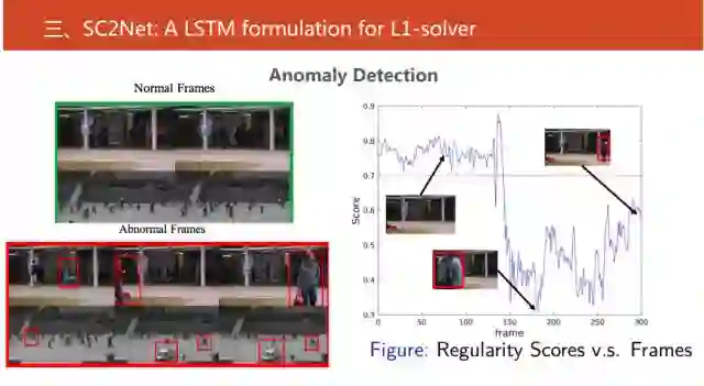 我们还做了视频当中的异常事件的检测,给定一个圈,在圈中的都是正常事件,不在圈中的就是异常事件。接下来使用稀疏重构系数作为指标,找到一定阈值,在这个范围内的都是正常事件,而不在其中的就是异常事件。