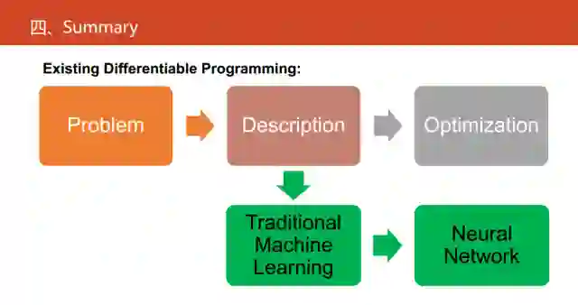 下一步可微编程做什么?现在的可微编程是对传统的继续学习方法的等价或者一种替代物。从问题的描述,再到问题的建模、求解,这是一个很复杂的过程。如果我们对传统的学习的方法,在一定的假设和前提下已经有建好的建模,我们建立等价的神经网络,其实就能走出最容易的一步。