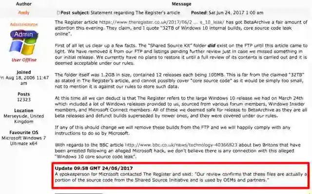 Betaarchive 发表官方声明,称文件夹大小仅仅为 1.2GB,并非是机密数据。微软发言人随后也证实,这些源代码是通过共享代码计划与 OEM 厂商和合作伙伴分享的源代码的一部分。(来自:Solidot)