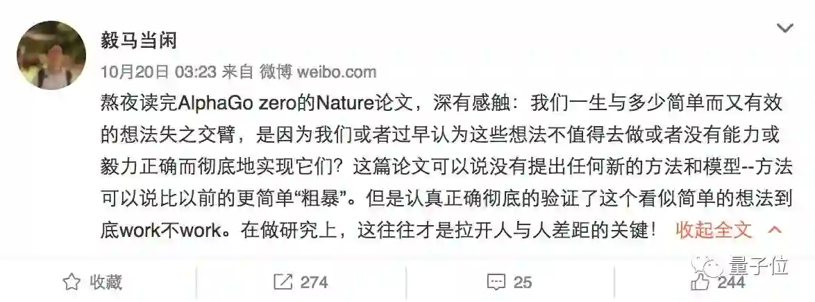 熬夜读完AlphaGo zero的Nature论文,深有感触:我们一生与多少简单而又有效的想法失之交臂,是因为我们或者过早认为这些想法不值得去做或者没有能力或毅力正确而彻底地实现它们?这篇论文可以说没有提出任何新的方法和模型——方法可以说比以前的更简单“粗暴”。但是认真正确彻底的验证了这个看似简单的想法到底work不work。在做研究上,这往往才是拉开人与人之间差距的关键。
