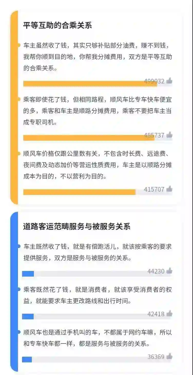 这就意味着乘客和车主之间并非服务和被服务的关系。事实上,这一观点,也得到了不少网约车用户的认可。嘀嗒在自己的平台上发起的30万用户参与的“顺风车车主乘客关系讨论”测试中,86%的用户认为双方属于“平等互助的合乘关系”,认为属于“道路客运范畴服务与被服务关系”的用户仅占14%。