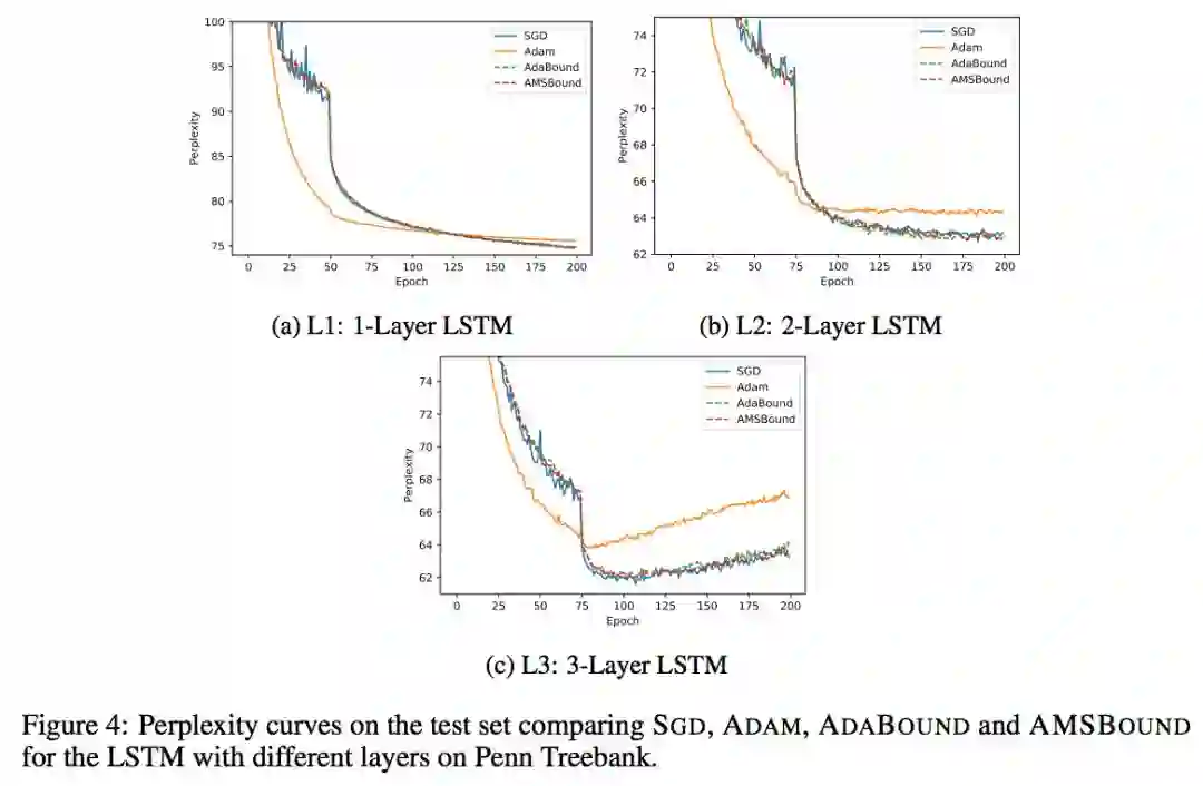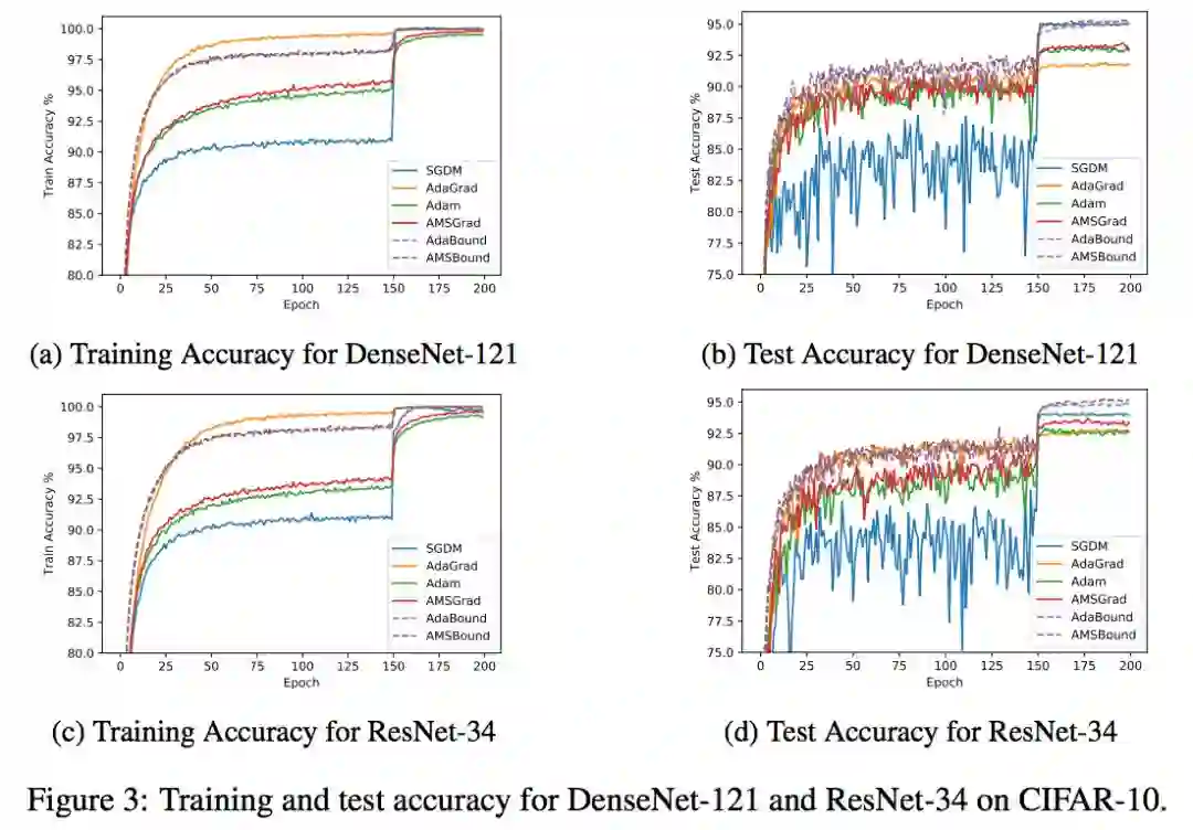 作者将 AdaBound/AMSBound 和其他经典的学习器在一些 benchmarks 上进行了实验验证,包括:SGD (或 momentum 变种)、AdaGrad、Adam、AMSGrad。以下是作者在论文中提供的学习曲线。