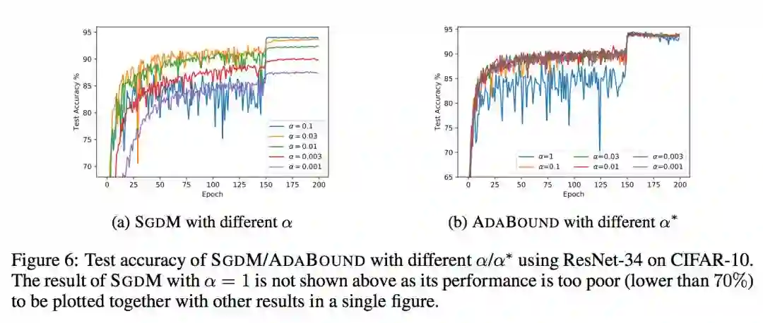这一结果表明了极端学习率的潜在负面影响,在有效解决这一问题之前,我们很可能无法使用自适应学习器得到足够好的最终模型;需要设法对训练末期 Adam 的学习率做出限制。