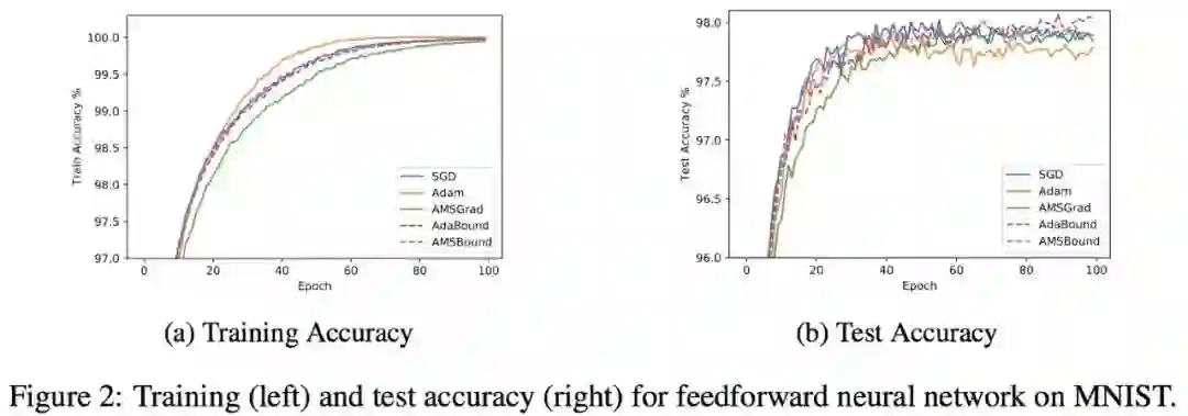 在这一设置下,在训练早期由于上下界对学习率的影响很小,算法更加接近于 Adam;而随着时间增长裁减区间越来越收紧,模型的学习率逐渐趋于稳定,在末期更加贴近于 SGD。AMSBound 可以对 AMSGrad 采用类似的裁剪得到。