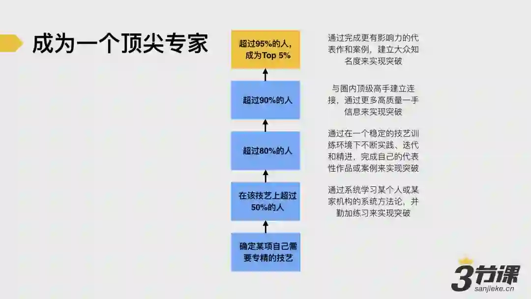 其实,成为一个顶尖专家的路径,从道理上来理解是比较简单的——你只需要选定好某项技能或手艺,然后在该领域内一点一点去超越更多的人,最后成为Top5%就可以了。