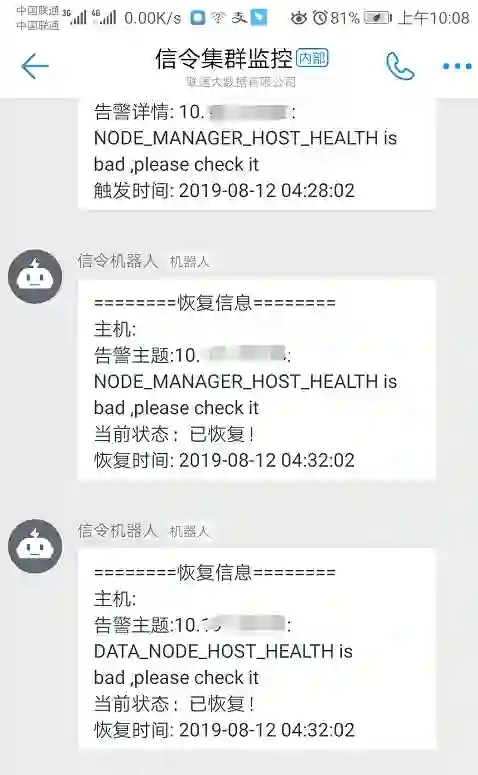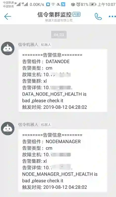 如下图:监控告警发现NodeManager实例发生故障实践在2019-08-12 04:28:02,一般这个时间段,运维人员都在深度睡眠。这时自愈程序将根据告警自动恢复角色实例,恢复实践周期在5分钟之内,于2019-08-12 04:32:02 DN实例和NM实例恢复上线。