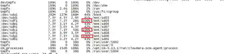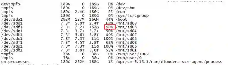 5)集群个别节点上的磁盘存储超过90%的阈值。