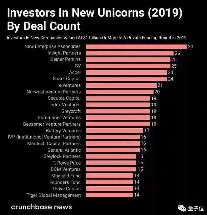如果按照投资笔数来算,恩颐投资 (NEA) 为这些新独角兽贡献过30笔,排在第一: