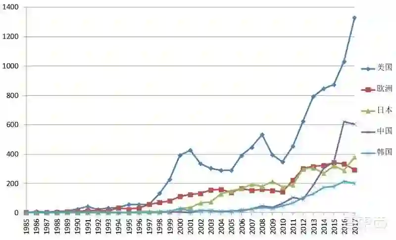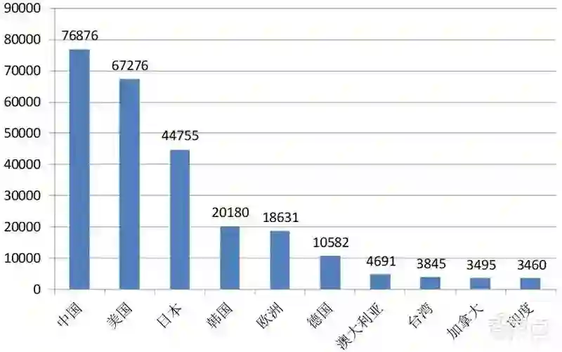 日本的申请量趋势虽然整体呈上升趋势,但与中国、美国、欧洲地区有所不同的是,日本专利申请量在20世纪90年代末就率先加快了上升速度,在进入21世纪之后反而趋于平缓,虽然同样在2010年之后迎来了增长期,但增长速度明显无法和其他几个国家和地区相比。