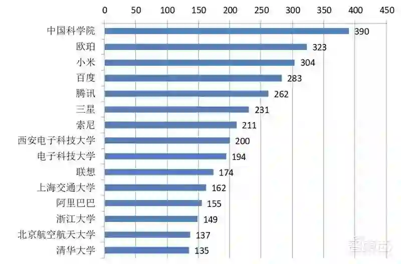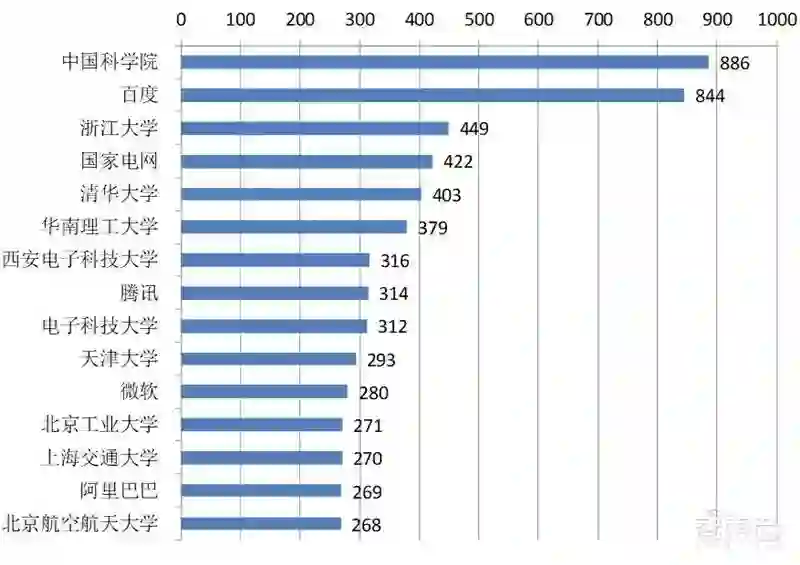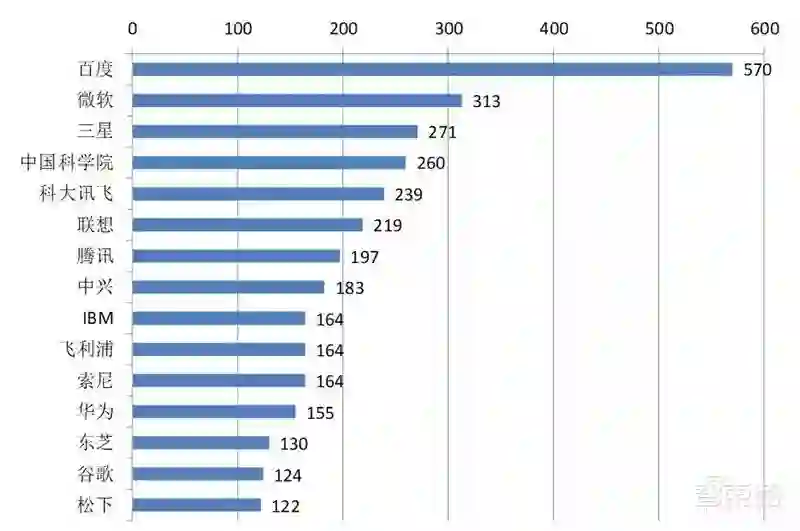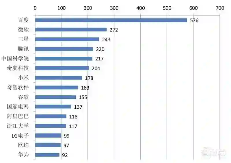 与机器学习和基础算法形成鲜明的对照,在智能搜索和智能推荐方向,专利申请的主力是大型互联网企业及智能终端厂商。国外申请人有四位上榜,分别是微软、三星、谷歌和LG。在国内申请人中,百度的申请量以576件遥遥领先,腾讯以220件位列国内申请人的第二位。在科研机构中,中国科学院和浙江大学排进了前15位,但申请量并不是很大。