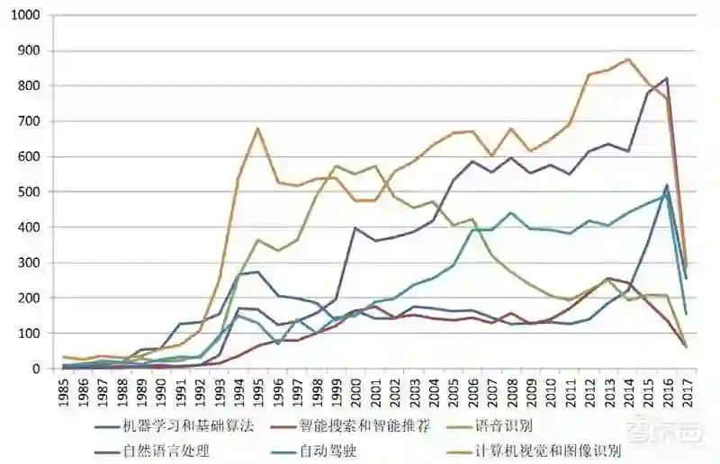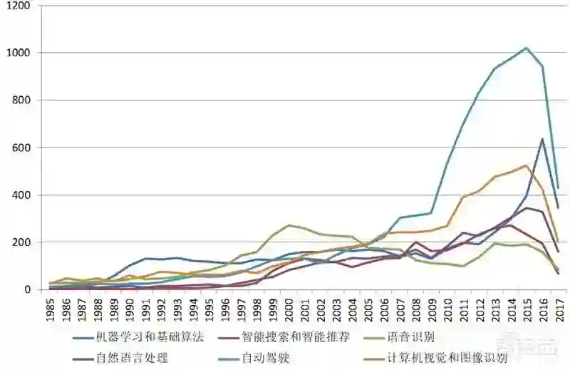 人工智能领域的研究方向涉及多个不同的学科,在应用层面也涉及到多个子领域。本章选取人工智能领域中比较有代表性的几个技术分支作为研究对象,对各个技术分支的专利申请量和申请人进行分析,绘制各个技术分支的技术生命周期,以期得出人工智能领域技术发展的脉络。