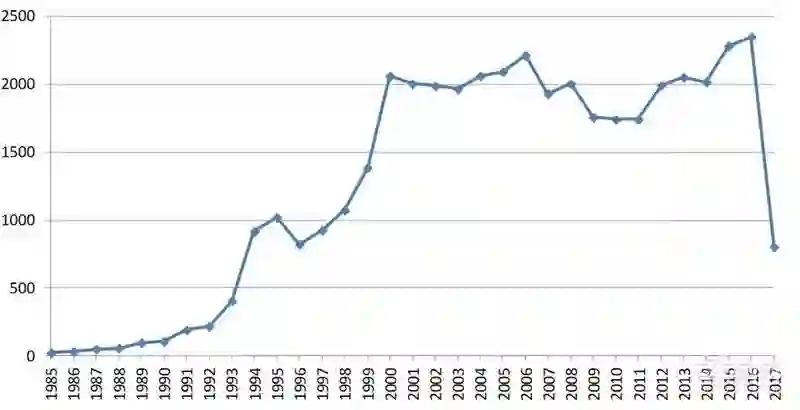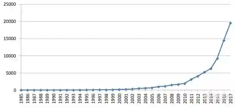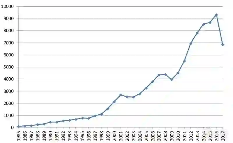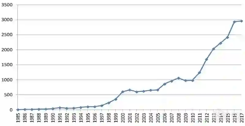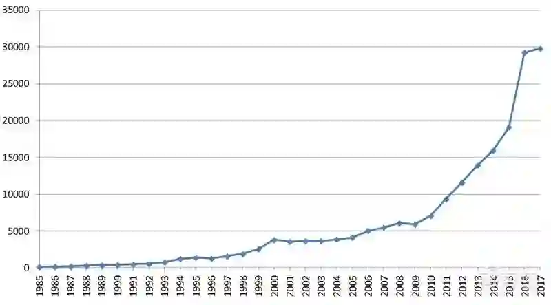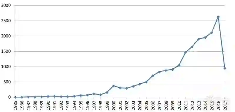 下图揭示了从1985年至2017年各年度的申请量变化情况。全球范围内,人工智能领域的专利申请量总体上呈逐年上升趋势,在2010年后增长速度明显加快,近两年的增长率更是令人瞩目。由此可见,人工智能领域已经成为世界各国的研发热点,正在迎来全面的技术进步。