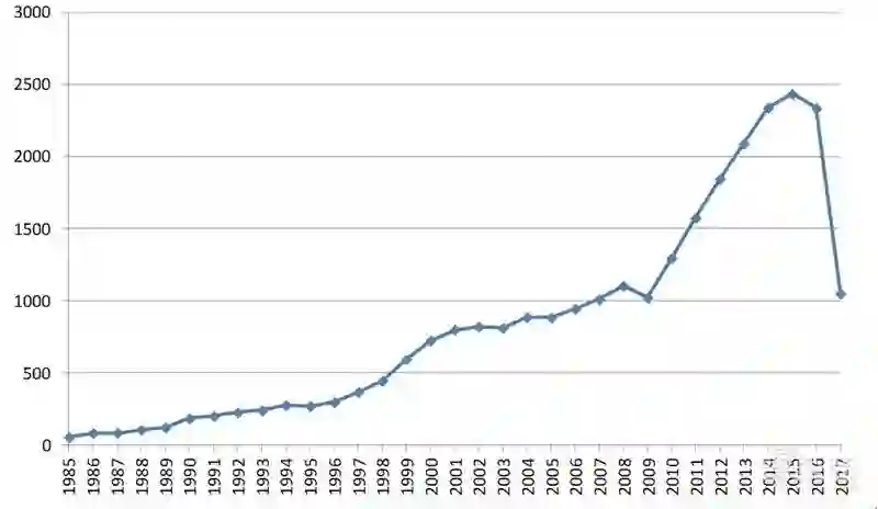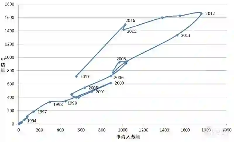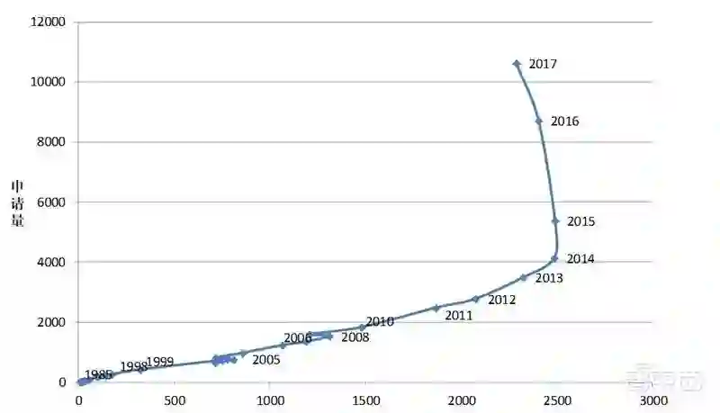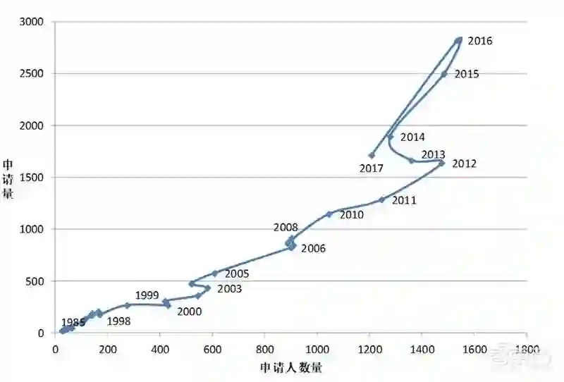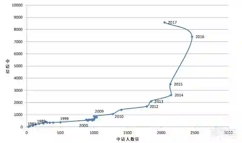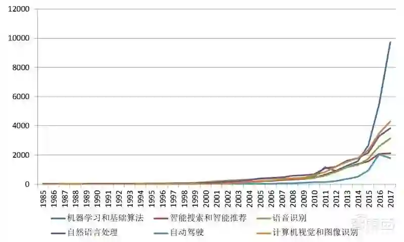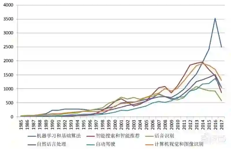 机器学习和基础算法这一技术分支在1985后一直处于缓慢的增长中,仅在1999、2000年左右有过短暂的技术活跃期,在熬过近十年的技术停滞期后,终于在2009年之后迎来了一次快速的发展。而近几年则慢慢出现了技术成熟期的特点:2014-2015年间申请人数量几乎不变,2015-2016年间申请人数量的增长低于申请量的增长,2016年的申请量比2015年的申请量翻了一番还多,2017年申请量增长的速度有所下降,而申请人数量大幅度下降。
