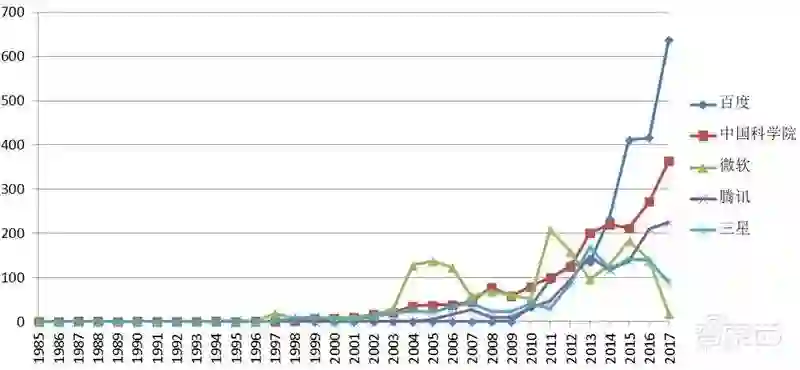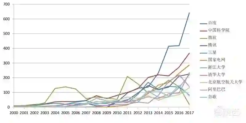 在我国国内各公司的申请量趋势非常一致,保持了一个平稳的持续增长的速度,而其中,百度和中国科学院的申请量在2013年之后增长远超其他专利权人,其中又以百度为首,其申请量增速在2013年之后有了飞跃的提升。而其中各个专利权人在2017年的申请量有了分化,其中属于国外的公司的申请量均有所下降,很大的原因是因为2017年的申请还有很多没有公开,因而无法体现在数据中,但是中国本土的公司、高校和科研院所的申请量不降反升,这其中,一部分原因可能是国内的这些专利权利人的申请量进一步增加,另一部分也和国内现在很多专利权人要求提前公开、进入优先审查流程等快速通道有关。
