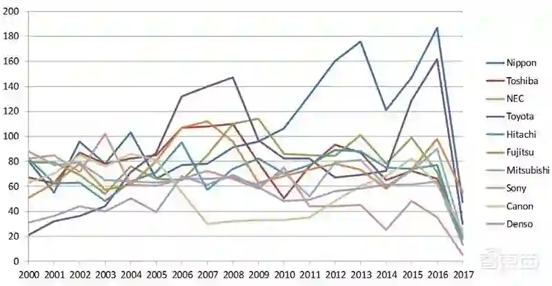日本的申请量变化趋势在几个国家和地区中最为复杂,且除了个别公司,如Nippon,Toyota之外,其他几个公司找不到明显的具有上升趋势的申请态势,申请量反而从2000年之后一直处于剧烈的波动状态,甚至索尼公司的申请量一直在逐年走低。而这些专利权人的申请量在2017年基本上都有了一定程度的回落,可能是由于部分2017年的专利申请未公开的情况造成。