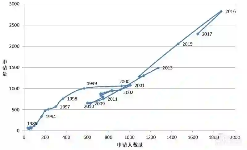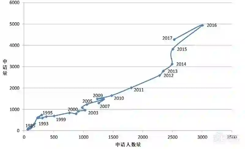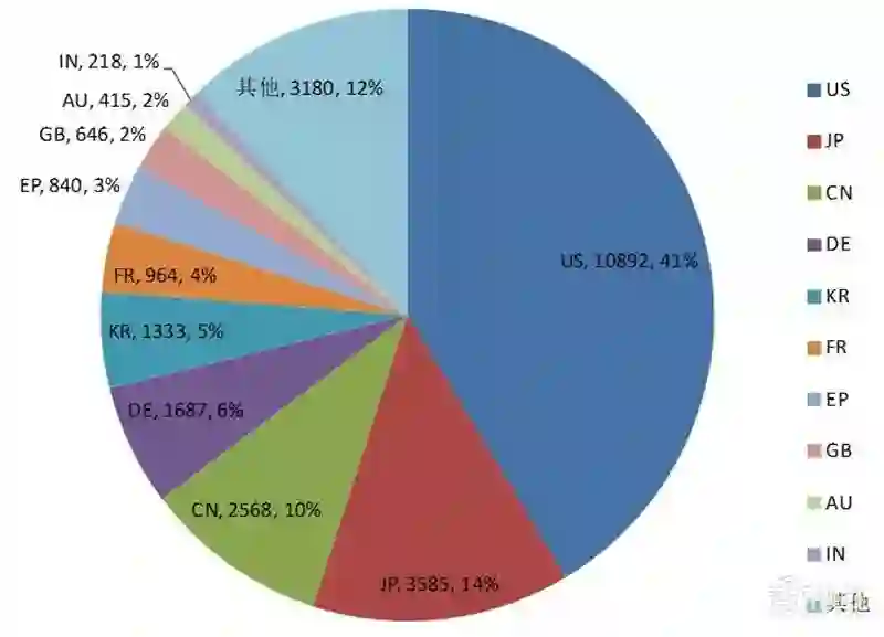 美国申请量整体呈现平稳上升的趋势,在2010年之后有过一段迅速增长的时期,最近两年的增长速度稍微放缓,2017年的申请量下降可能是由于部分2017年的专利申请未公开的情况造成。