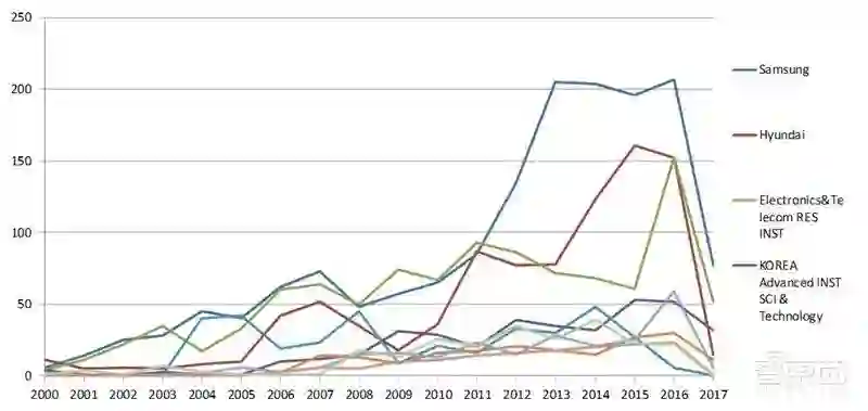 韩国的申请量变化趋势和中国的非常相似,基本上在从2000开始的申请量极其微小,随后开始缓慢增加,从2010年之后增速相对加快,其中三星公司的申请量从2010年之后进入快速增长期,到2013年达到顶峰后走向平缓。现代公司的申请量则是在2015年达到顶峰。这些专利权人的申请量在2017年基本上都有了一定程度的回落,可能是由于部分2017年的专利申请未公开的情况造成。
