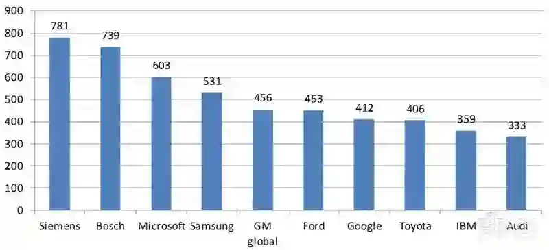 下图为各个主要专利权人在欧洲地区(包括欧专局和欧洲几个主要国家如英、法、德等)的申请量。可以看出排名靠前的几家公司,欧洲公司(如西门子、博世、奥迪)、美国公司(如微软、通用、福特、google、IBM)和日韩公司(三星、Toyota)基本上平分秋色,其中又以欧洲公司西门子和博世申请量位列榜首和第二位。