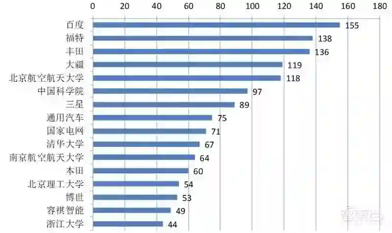 在自动驾驶方向,排名前15的申请人以企业申请人为主,但是这些企业主要是以福特、丰田为代表的国外老牌汽车生产厂商。国内的企业仅有百度、大疆和容祺智能挤进榜单,百度作为上榜的唯一一家互联网公司,申请量列于首位,这应该归功于百度近年来投入研发的无人驾驶项目。而大疆和容祺智能都是生产无人机的厂商,在这一领域的专利申请反而走在了国内各大汽车制造商的前面。科研机构申请人中,北京航空航天大学的申请量最高,应该与该学校特殊的专业设置和研究方向有关。