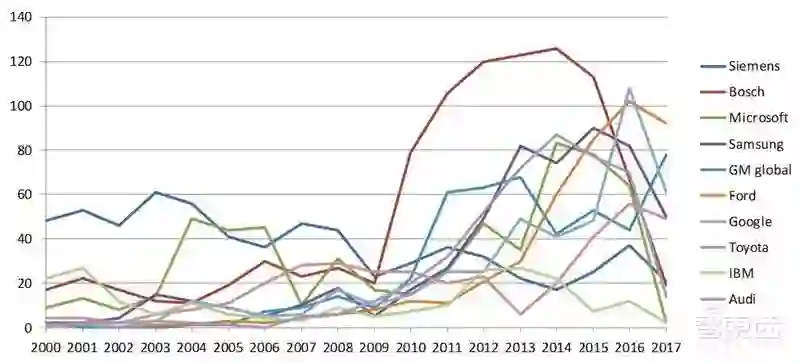 不同于中国和美国,其申请量趋势基本上随着年代的更新而持续增长。欧洲地区的大部分专利权人的申请量的峰值在2014-2016年之间,随后走向颓势,这也和欧洲地区申请量的整体情况相吻合。而其中总体申请量占首位的西门子公司,其申请量反而从2003年之后一直在走向回落,随后在2014-2016年有小幅上扬。排名第二的博世公司在2009年之后申请量有了巨大提升,随后增速在2012年放缓后,申请量在2014年达到顶峰后开始回落。