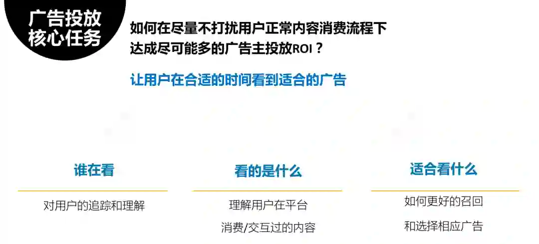简单来讲,广告投放核心任务是让用户在合适的时间看到适合的广告。我们可以拆解成三个部分,分别是: