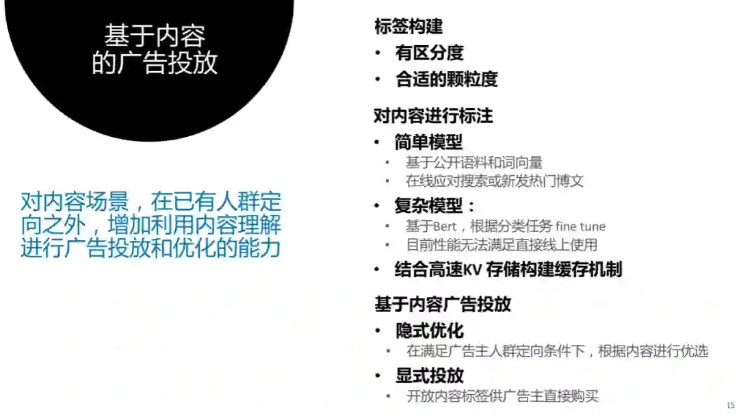 基于内容的广告投放是针对内容场景,除了在已有人群定向之外,增加利用内容理解的方式进行广告投放和优化的能力,主要分为:
