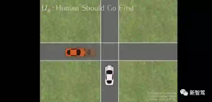 Anca称她最喜欢的一个例子是,仍然是四面停止标志的十字路口,当处于僵持、没有乘客的无人车(橙色)需要表示“你先走”的时候,无人车会稍稍后退,在这个路口中,人类司机同样在进行效率和安全的博弈,而当无人车后退的时候,车辆相撞的几率变小,此时人类司机就会通过路口,达到人类车辆效用函数的最大化。