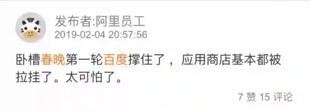 可惜,今年的百度是史上第一个扛住春晚流量的公司,游刃有余,毫不费力,反观各大手机应用市场、包括App Store、小米和华为就没那么幸运了,都被用户挤爆。
