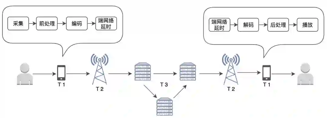 综上所述,由于音视频在采集与播放端上的延时取决于硬件性能、编解码内核的优化,不同设备,表现不同。所以通常市面上常见的“端到端延时”指的是 T2+T3。