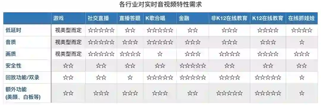 我们通过下表看到每个行业对实时音视频部分特性的大致需求。但是每个行业,不仅对低延时的要求不同,对延时、音质、画质,甚至功耗之间的平衡也有要求。在有些行业中,低延时并非永远排在首位。