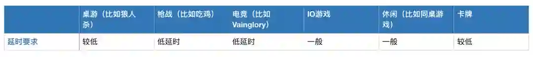在手游场景下,不同游戏类型对实时音视频的要求不同,比如狼人杀这样的桌游,语音沟通是否顺畅,对游戏体验影响很大,所以对延时要求较高。其它类型游戏具体如下方表格所示。