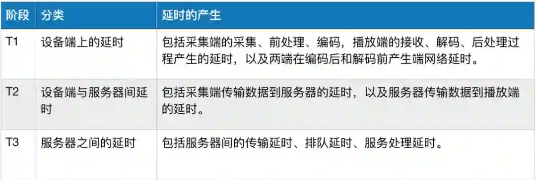 在音视频传输过程中,在不同阶段都会产生延时。总体可以分为三类: