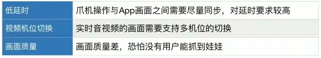 在线抓娃娃是近期新兴热点,主要依靠实时音视频与线下娃娃机来实现。它对实时音视频的要求包括: