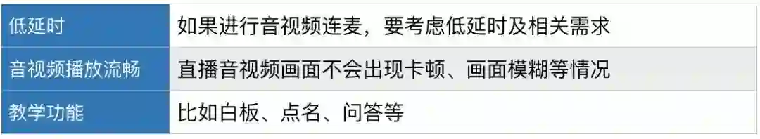 另一类是 K12 在线教育,比如英语外教、部分兴趣教学,通常会有一对一或一对多的师生连麦功能,它对直播场景的要求包括: