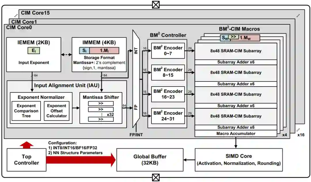 3) ReDCIM采用层次化可重构存内累加架构,在同一个CIM单元内灵活支持多种浮点(BF16、FP32)和整数(INT8、INT16)计算能力,满足云端AI计算需求。