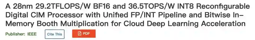 1.Tu, F., et al. A 28nm 29.2TFLOPS/W BF16 and 36.5TOPS/W INT8 Reconfigurable Digital CIM Processor with Unified FP/INT Pipeline and Bitwise In-Memory Booth Multiplication for Cloud Deep Learning Acceleration. in 2022 IEEE International Solid- State Circuits Conference (ISSCC). 2022. IEEE.