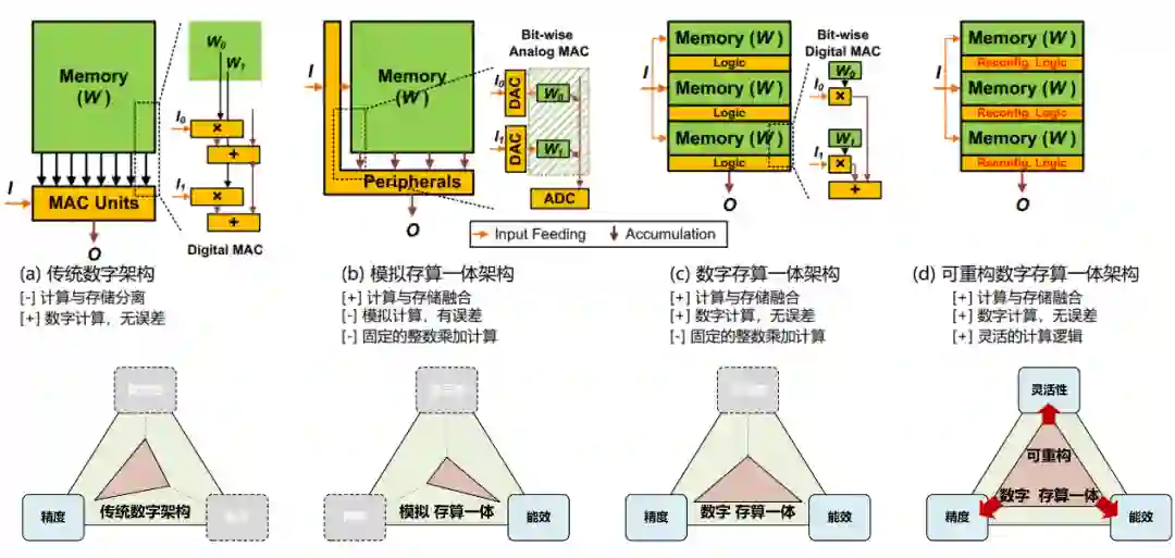 图 2:AI芯片架构对比:(a)传统数字架构,(b)模拟存算一体架构,(c)数字存算一体架构,(d)可重构数字存算一体架构。
