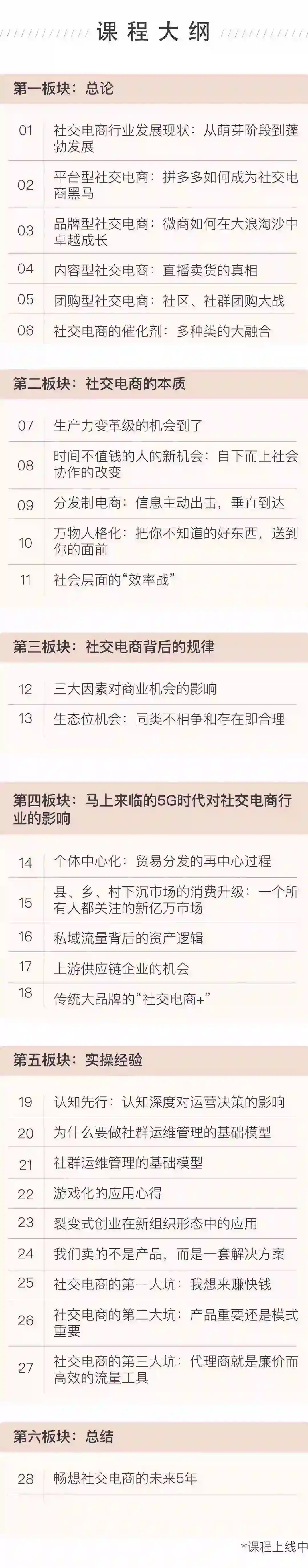 A:共6章28节课时,形式为线上音频课程+逐字稿课件,每周更新。