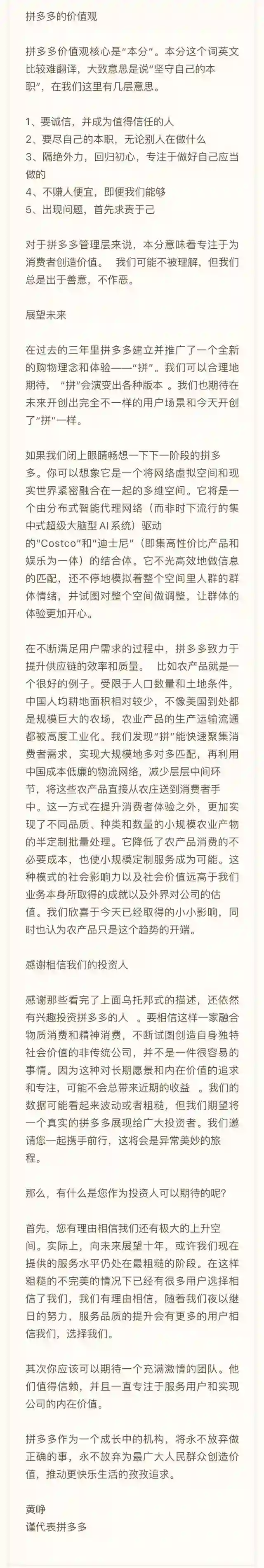 黄峥在致股东信中强调,“对于拼多多管理层来说,本分意味着专注于为消费者创造价值。 我们可能不被理解,但我们总是出于善意,不作恶。”