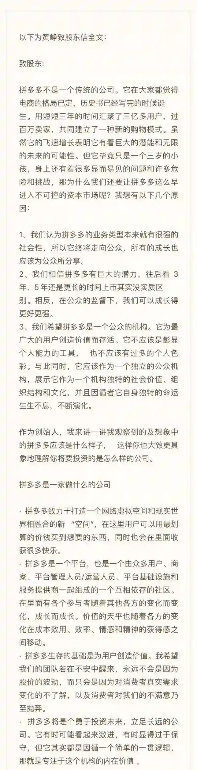 黄峥发布了一封致股东公开信,在解释为何提前上市时,黄峥表示,“虽然拼多多是一个三岁的小孩,身上有很多显而易见的问题,也面临许多危险和挑战。但拼多多的业务有很强的社会性,所以它终将走向公众,所有的成长也应该为公众所分享。”